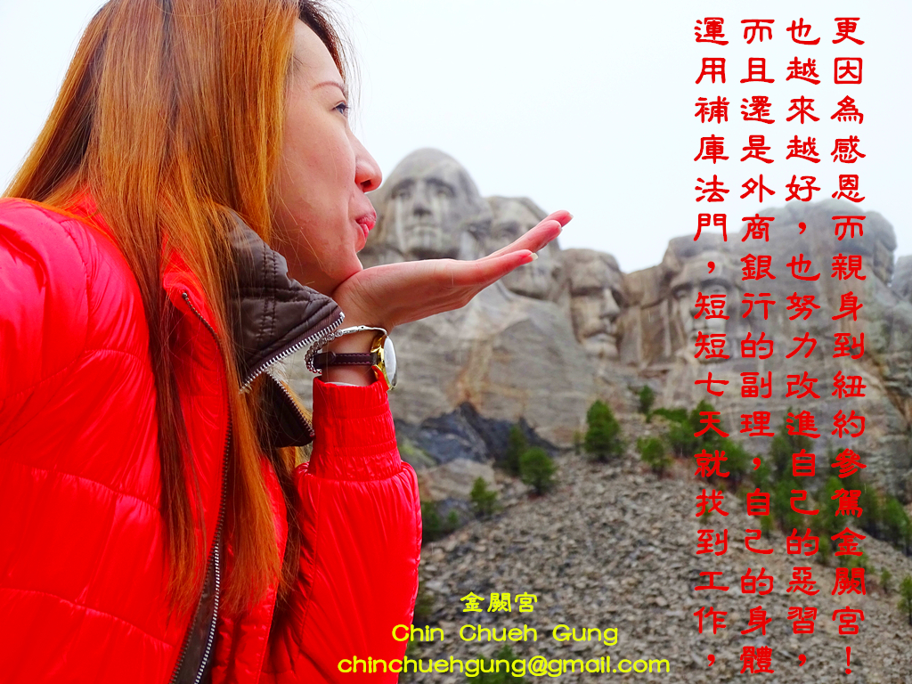 唉,如果說我之前的路都白走了,誰還值得我相信?我也沒錢在被騙了!所以,講回來重點⋯在對五界真人絕望的同時看到他們的網站,一直寫信警告美國金闕宮,一封不夠還寫了七封,我覺得很好奇點了進去,反而引起我的興趣,連結到金闕宮官網,發現裡面好多真人真事,也有關於靈異體質怎麼解,當下就寫了信問問宮主阿爸何時有回台,想不到隔天馬上就收到回覆,他們在板橋,離開台中了,還很不好意思的說如果願意可以去板橋一趟,說時遲那時快,這是我人生中做的最對的決定,運用補庫法門,短短七天就找到工作,而且還是外商銀行的副理,自己的身體也越來越好,也努力改進自己的惡習,更因為感恩而自費去紐約參駕金闕宮!