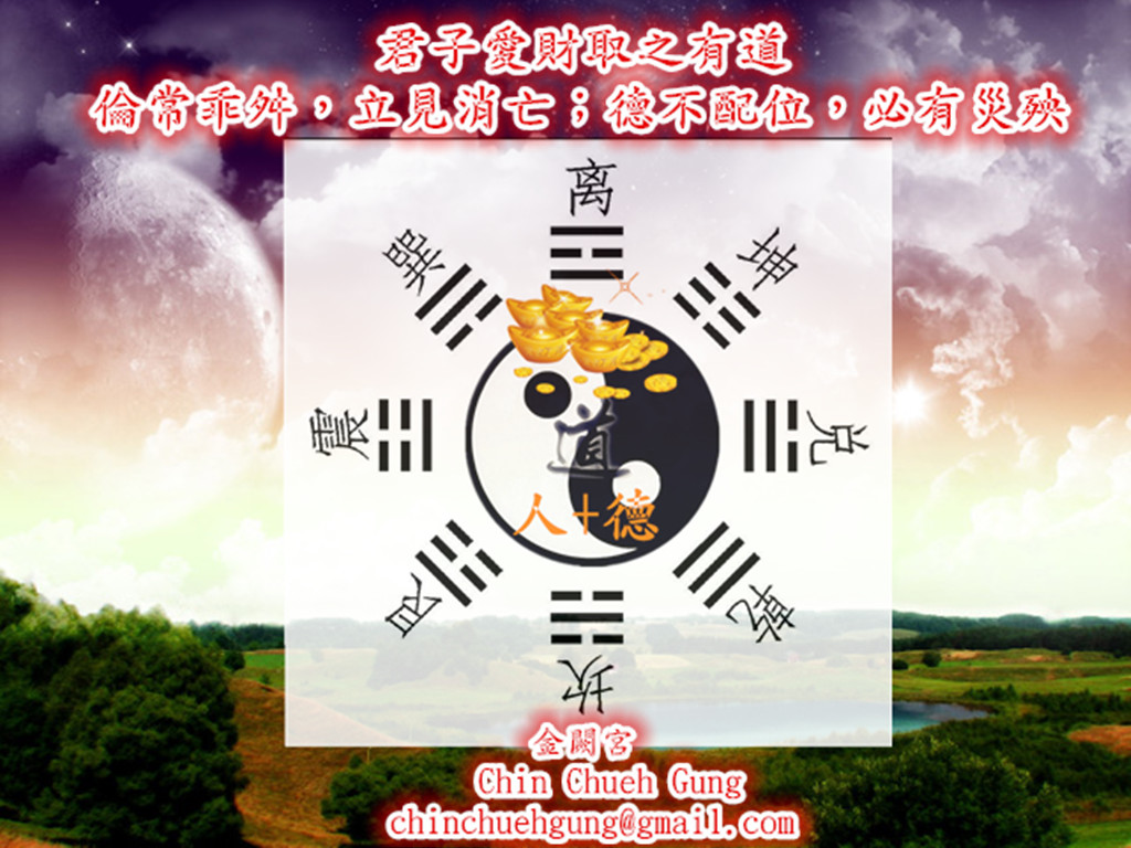 現代人一覺起來,就與錢息息相關。打開水龍頭,洗洗臉,要付水費,看個電視,要付電費,開車上班,要付油錢,三餐費用就更不用說了,好不容易存一些錢,又要繳稅給政府,對上班族而言,錢總是不夠用。如果有很多的錢,就可以做很多自己想做的事,例如:到高檔餐廳吃一餐,買部好車犒賞自己,到百貨專櫃挑一件衣服,跟櫃姐說,這件不要,其他包起來。走到豪宅區,喜歡就馬上買。如此豪邁的花錢,很多人都垂涎已久,只是沒這麼多錢,無從花起。 有些生意人,嫌賺錢的賺個10%獲利太慢了,想要動點歪腦筋,提升一下趴數。於是賣油的,收集回鍋油再賣;賣麵包的,加了香精,吸引消費者大買;賣牛奶的,加了三聚氰胺,壓低成本;蓋房子的,10根鋼筋變8根,反正水泥蓋上去也看不到,地震來了也搖不倒,因為建築師早料到會貪,鋼筋早就多設計幾根讓你們貪;……;這些取之無道的賺錢方法,天天出現在我們生活周遭,有形的被發現,要受到法律制裁,還要罰錢;無形的靈體,在睡夢中,常被無形的兵將拖出來修理,只是有形的身體以為太累而感到疲憊。 也有人想做善事,卻不想花自己的辛苦錢,也因為自己辛苦賺不到甚麼錢,能做的善事太少,引不起大家的注意。於是就成立了功德會,大舉募款,做一些大家看得到的善事,也累積不少財富,但是,錢永遠不嫌多,這些多餘的捐款,拿去炒地皮,買股票,買基金,管他邪惡不邪惡,能穩定獲利就好,這又讓財富如雪球般愈滾愈大。但是,這些財富,也是取之無道,因為收到別人的捐款,就要幫人做善事,要讓功德回到捐款人身上,而不是由自家的功德會獨攬。所以這些取之無道的金錢,在捐款人百年之後,發現真相竟是一分一毫的功德都沒有,必定會申訴,掀起討債狂瀾,一波猛過一波。這些自以為做善事的義工,身體也會漸走下坡,子女也出問題,因為沒有人可以跟討債鬼同住一個屋簷下而不出事的。 白花花的銀子,沒人不愛,愛錢,也是天性,無可厚非,只是要取之有道。例如,嫌薪水太少,可以假日兼職打工,或是搞個網拍副業。如果自己能力學歷工作態度都好過別人,薪水卻不到別人的一半,這種不正常的情況,十之八九就是討債鬼上門了。要請走他們的方法,就是在玉皇大天尊的見證之下,燒化後一刀兩斷,不再侵犯。接著如果還覺得不夠,可以補福德庫,請土地公幫忙你賺錢,這才是君子愛財,取之有道。只是要先花很多錢。於是,很多人不捨得花錢,就轉向上帝祈禱,把自己的靈獻給上帝,的確有些人也因此賺錢,升官,只是拿到錢的代價,是出賣自己的靈魂換來的,這划得來嗎?